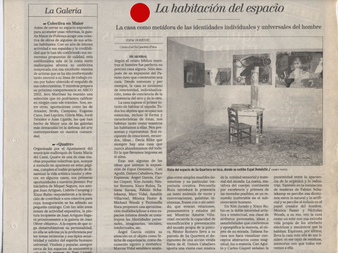 ESPAI DOMÈSTIC | Exposició col·lectiva | Centre d’Art Sa Quartera d’Inca Fecha: diciembre 30, 2001Autor: pacoespinosaa Categoria: Escrits | Publicacions | Premsa, Panell d'exposicions Navegador de artículos ← A dret fil | Exposició individual | Espai Ramon Llull …Y ADIÓS A TODO ESO | Exposició col·lectiva | Galeria Xavier Fiol → 2001 ESPAI DOMÈSTIC | Exposició col·lectiva | Centre d’Art Sa Quartera d’Inca, Illes Balears, Espanya (catàleg). >>>>>>>>>>>>> EL MUNDO/EL DIA DE BALEARES, SABADO 12 DE ENERO DE 2002 Comparte esto: Compartir en X (Se abre en una ventana nueva) X Compartir en Facebook (Se abre en una ventana nueva) Facebook Me gusta Cargando... Relacionado
