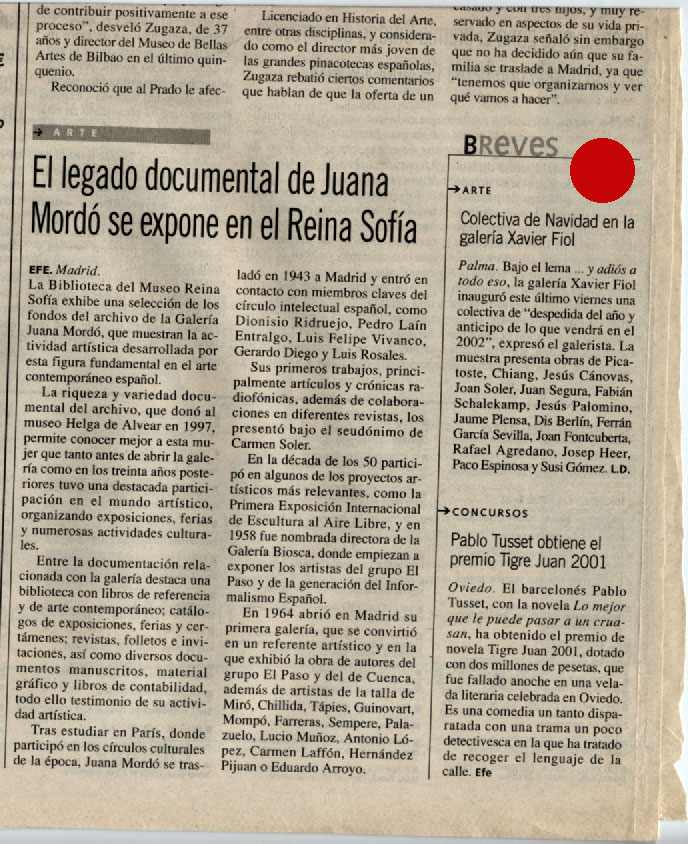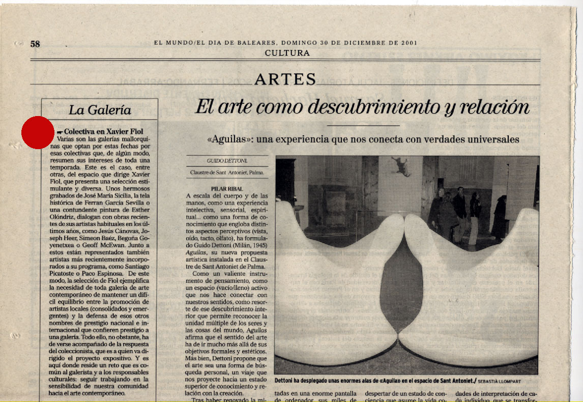 …Y ADIÓS A TODO ESO | Exposició col·lectiva | Galeria Xavier Fiol Fecha: diciembre 30, 2001Autor: pacoespinosaa Categoria: Escrits | Publicacions | Premsa, Panell d'exposicions Navegador de artículos ← ESPAI DOMÈSTIC | Exposició col·lectiva | Centre d’Art Sa Quartera d’Inca A dret fil | vídeo art project → 2001 …Y ADIÓS A TODO ESO | Exposició col·lectiva | Galeria Xavier Fiol, Palma de Mallorca, Espanya. EL MUNDO / EL DIA DE BALEARES. DOMINGO 30 DE DICIEMBRE DE 2001 >>>>>>>>>>>>> Diario de Mallorca. Domingo 16 de diciembre de 2001 Comparte esto: Compartir en X (Se abre en una ventana nueva) X Compartir en Facebook (Se abre en una ventana nueva) Facebook Me gusta Cargando... Relacionado