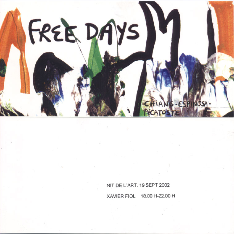 FREE DAYS | Exposició col·lectiva | Galeria Xavier Fiol Fecha: noviembre 30, 2002Autor: pacoespinosaa Categoria: Panell d'exposicions Navegador de artículos ← ARTISSIMA 9 | Itàlia | Fira Internacional d’Art ARCO 03 | Madrid | Fira Internacional d’Art → 2002 FREE DAYS | Exposició col·lectiva | Galeria Xavier Fiol, Palma de Mallorca, Espanya. Comparte esto: Compartir en X (Se abre en una ventana nueva) X Compartir en Facebook (Se abre en una ventana nueva) Facebook Me gusta Cargando... Relacionado