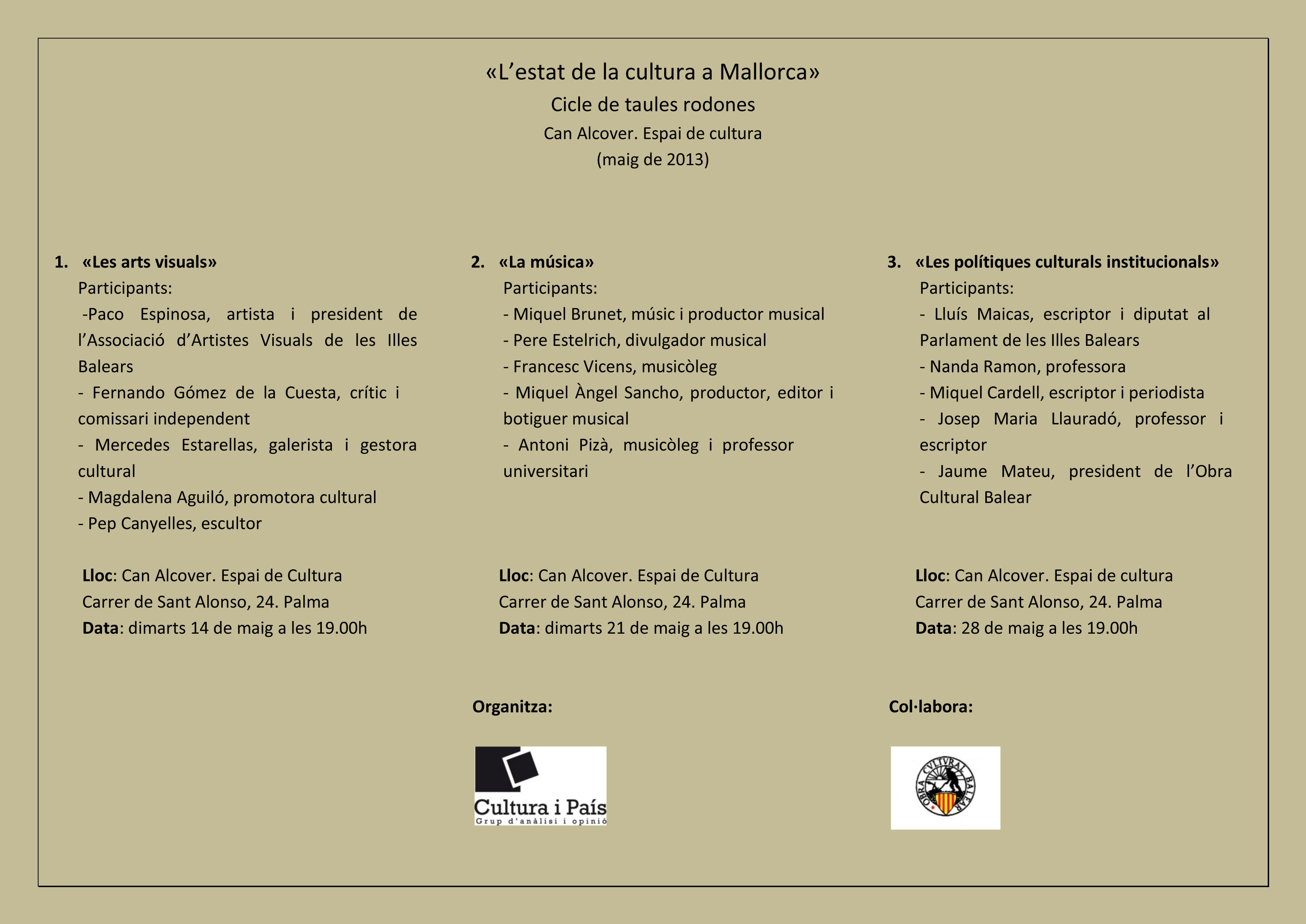 CICLE «L’estat de la cultura a Mallorca» | Taula rodona «LES ARTS VISUALS» | Paco Espinosa Ponent Fecha: mayo 14, 2013Autor: pacoespinosaa Categoria: Acció artística col·lectiva Navegador de artículos ← PACO ESPINOSA_WORKS IN PROGRESS | PALMA OPEN STUDIO (POST 13) Contacte | Paco Espinosa → Comparte esto: Compartir en X (Se abre en una ventana nueva) X Compartir en Facebook (Se abre en una ventana nueva) Facebook Me gusta Cargando... Relacionado